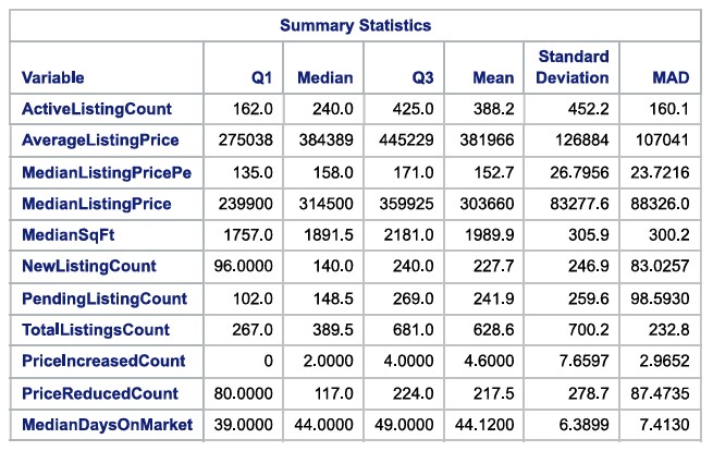 Looking at Mean and Median together provides interesting insights. Mean is greater than median for the parameters – Active Listing Count, Median square foot., New Listing Count, Pending Listing Count, Total Listing Count, Price Increased Count, Price Reduced Count. From this summary, it is possible to infer that there were a greater number of homes listed for sale.