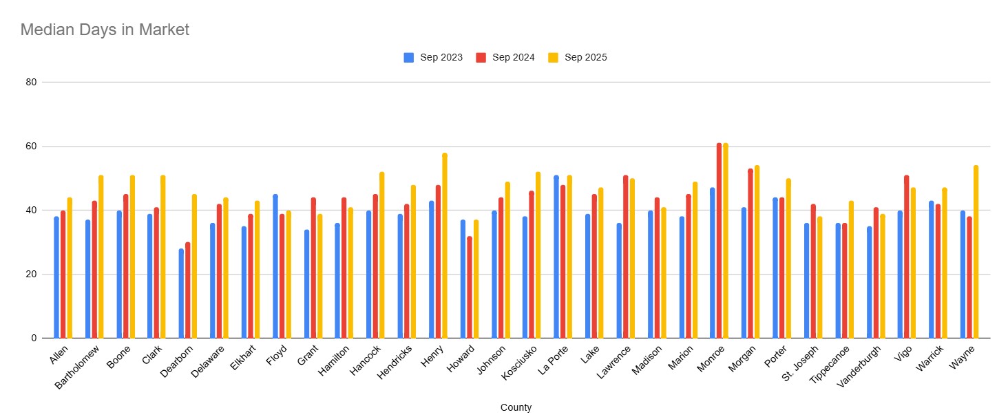 Putting all these parameters together, it can be interpreted that based on the data collected in September 2023, September 2024, September 2025 the housing market in the counties in Indiana had a greater number of lower-end priced homes listed in the market.