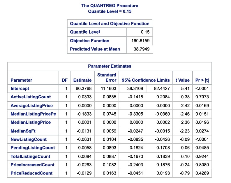 In a business context, this can be read as for those houses which are in the lower 15% values, the above parameters were significant factors in home sales. The average number of days in 15% quantile is 38.8 days. Hence for those houses which got sold in 38.8 days, the above parameters were significant criteria. For instance, a unit change in the median listing price square foot parameter negatively impacted the number of days a house was in the market. It brought down the number of days a house is on the market. Similarly, a unit change in the median listing price increased the number of days in the market by a factor of 0.0001. Similar interpretations can be done for each parameter and based on the interpretation, marketing and sales strategies can be revised to have quicker turnaround in sales.