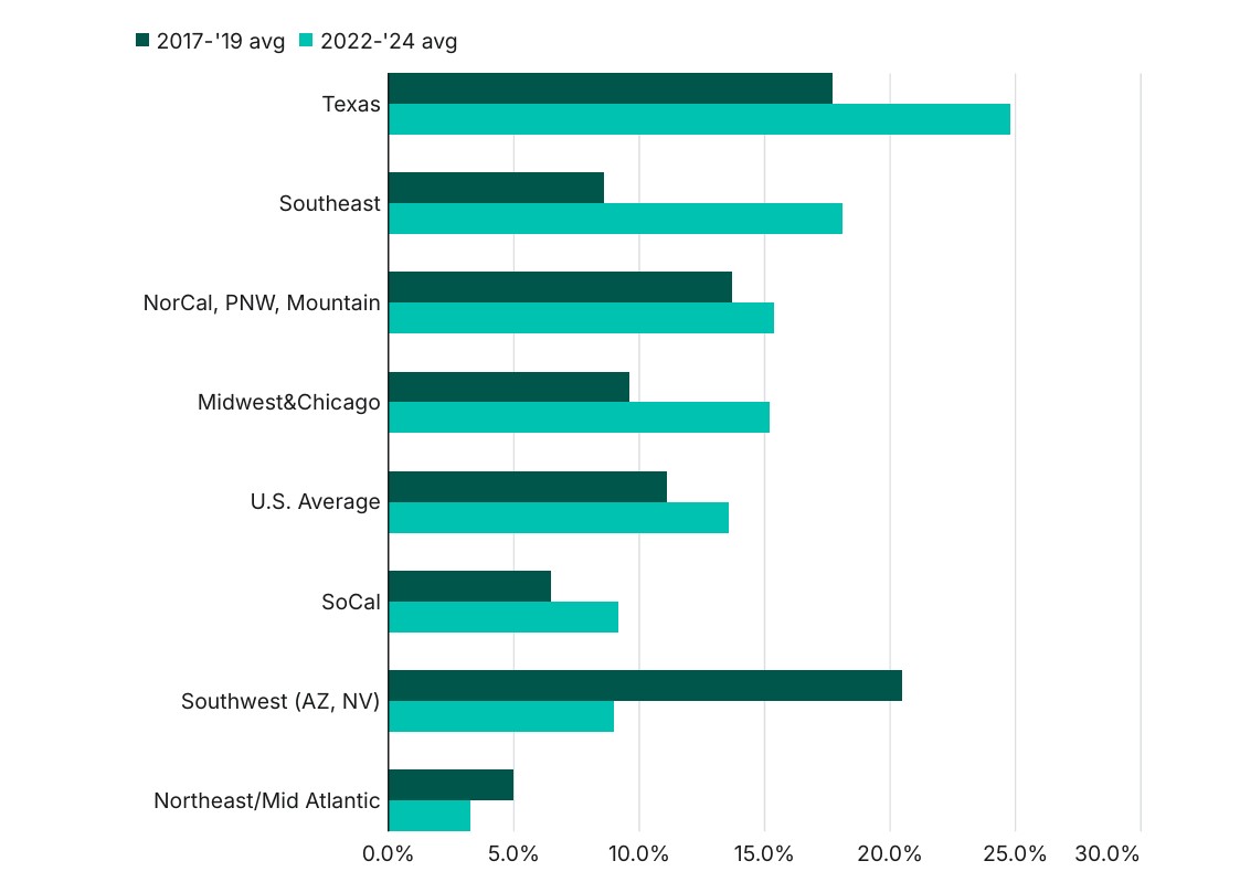 The underlying data from the chart shows the increase in manufacturing as a percentage of total leasing activities between the period 2017-19 and 2022-24. Delving deeper, regions in Texas,Southeast, Northern California, Pacific North West,Mountain, Midwest & Chicago and Southern California have shown an increase in manufacturing as a percentage of total leasing activities while it has decreased only for a couple of regions in Southwest and Northeast/Mid Atlantic. This trend tells that manufacturers will continue to lease warehouse spaces for their manufacturing activities.
